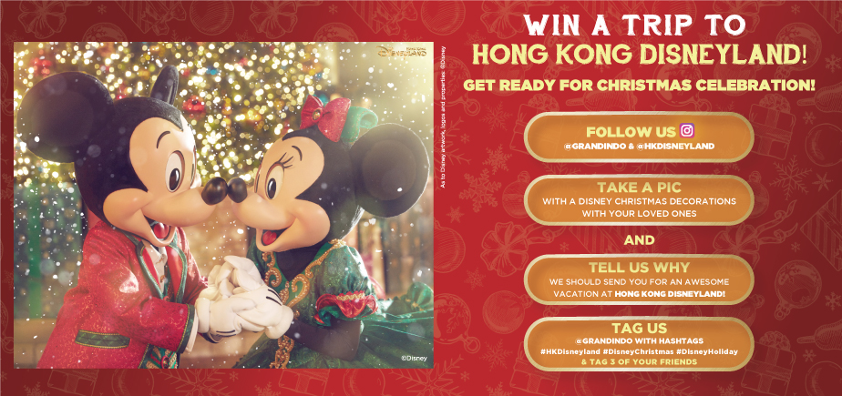 – Unggah foto terbaik dengan caption yang menarik dan mention @GrandIndo & @HKdisneyland menggunakan #MickeyGoesToGrandIndonesia #HKdisneyland #DisneyChristmas untuk memenangkan paket liburan ke HKDL